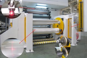 激光對邊,安全卡盤快速裝夾。采用圓盤式放卷,自動上卷,橫向電動調節,氣動錐頂或安全卡盤,全自動接換卷。可降低接換卷時間。